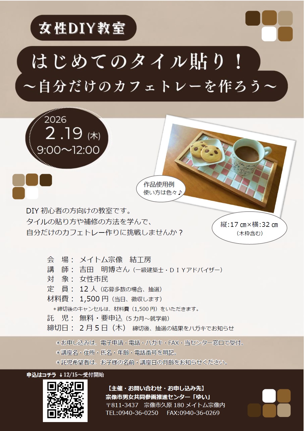 【2/19】女性DIY教室 はじめてのタイル貼り!~自分だけのカフェトレーを作ろう~