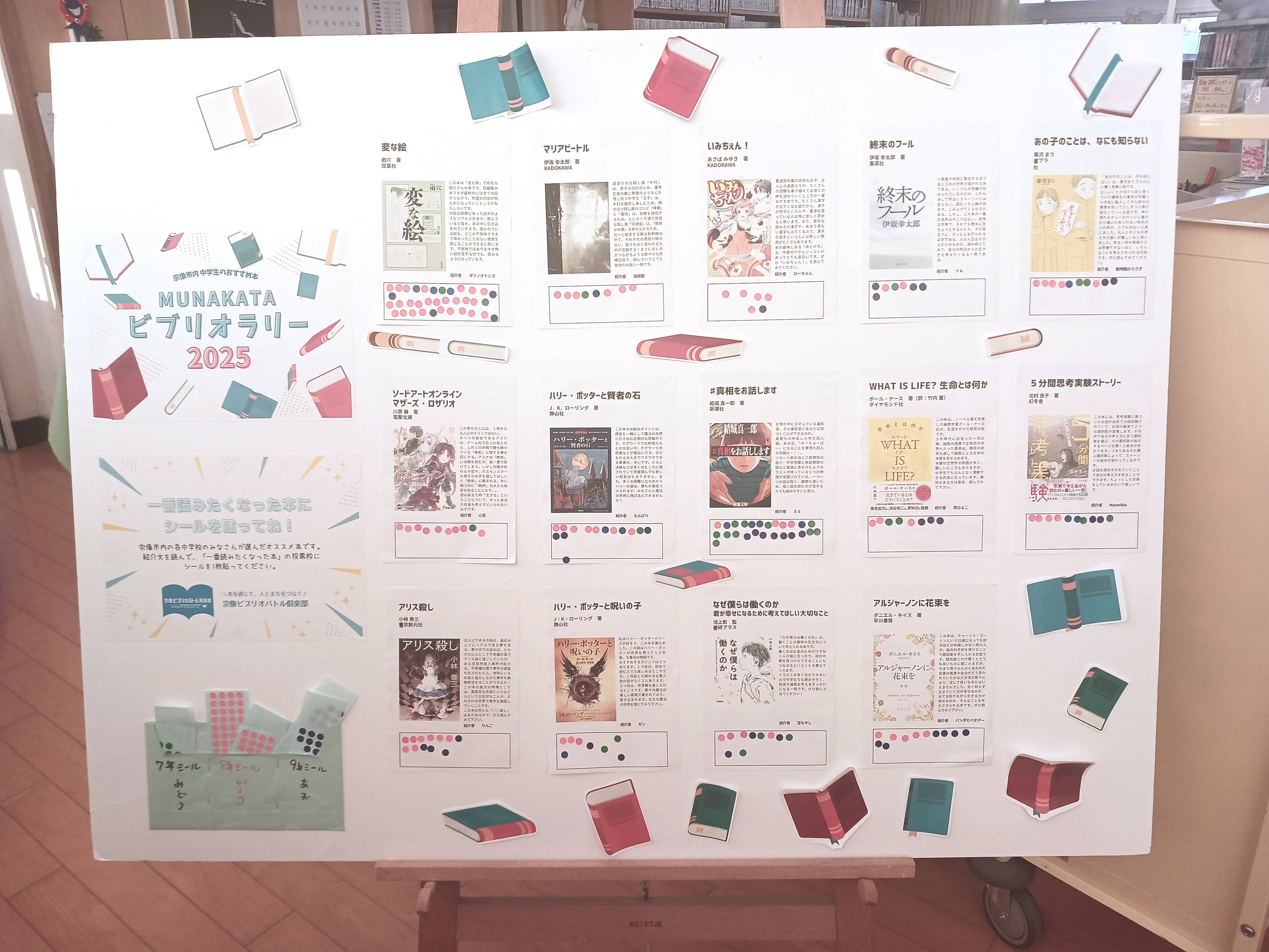 宗像ビブリオバトル倶楽部では、2020年から宗像市図書課の協力のもと、宗像市内中学生のオススメ本を紹介文とともにパネル展示し、読みたい本に投票シールを貼ってもらう「パネル展示型ビブリオバトル」を行なっています。パネルは各中学校内に掲示され、数多くの票の中からチャンプ本が選ばれています。