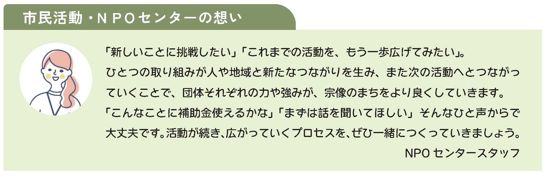 宗像市は、より多くの市民が主体的に市民活動(市民等が自発的に行う公益性のある活動)等に取り組み、他の市民やまちづくりとの関わりを通して生きがいを感じられる、活力ある市民主体のまちづくりを目指しています。