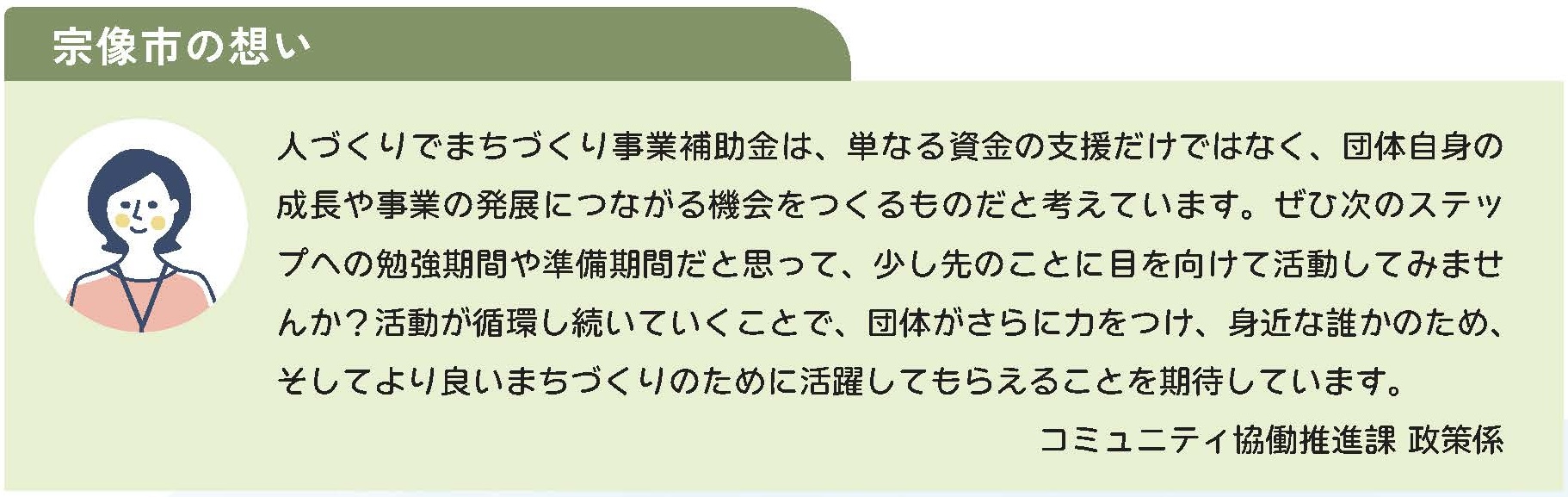 宗像市人づくりでまちづくり事業補助金(人まち補助金)を活用し、活動を “循環・継続” させていく4つのプロセスと、人まち補助金の活用例やそのコツについてはこちら。
