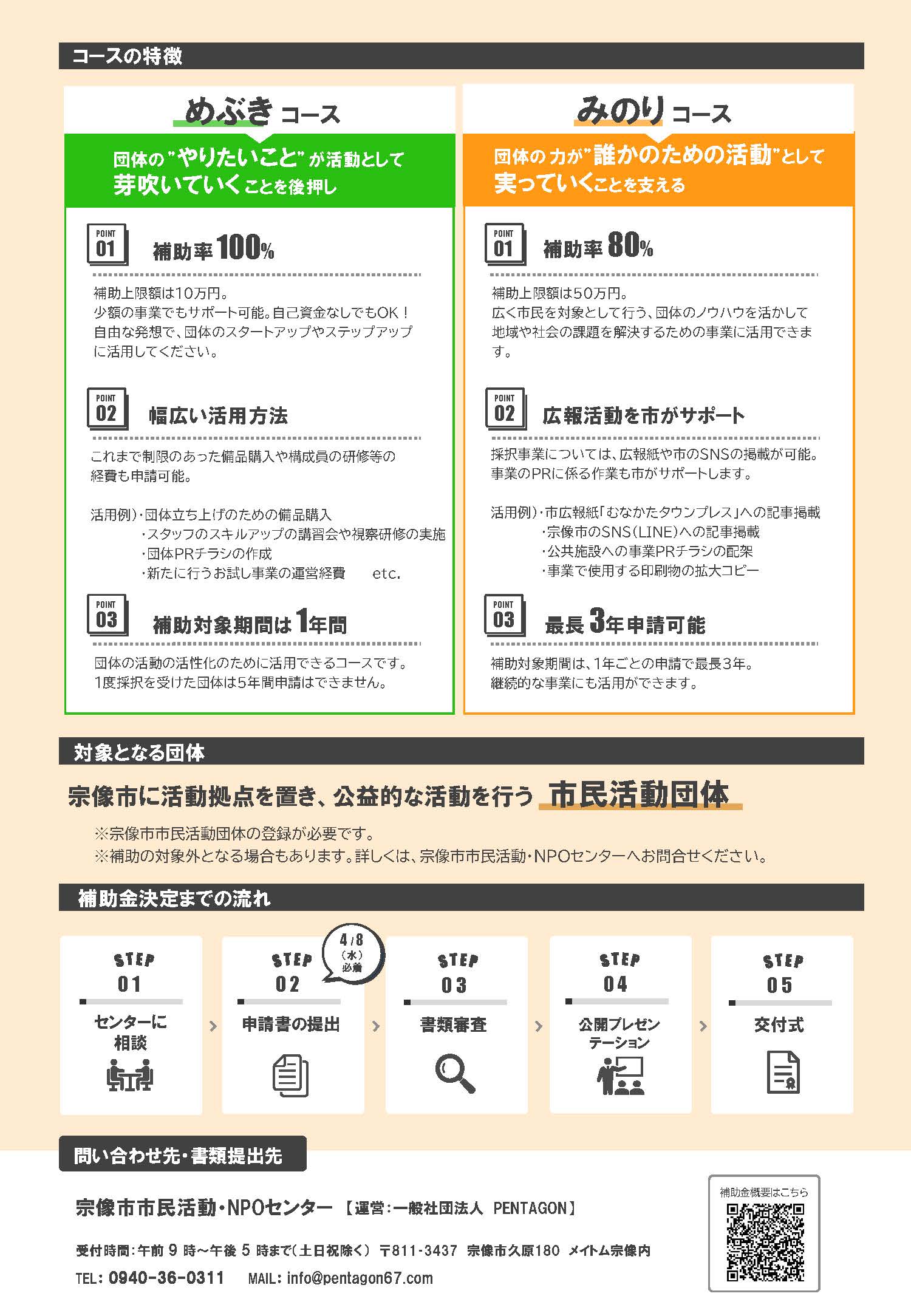 団体の”やりたいこと”が活動として芽吹いていくことを後押しする「めぶきコース」と団体の力が公益性のある”誰かのための活動”として、実っていくことを支える「みのりコース」の2つのコースを設けています。